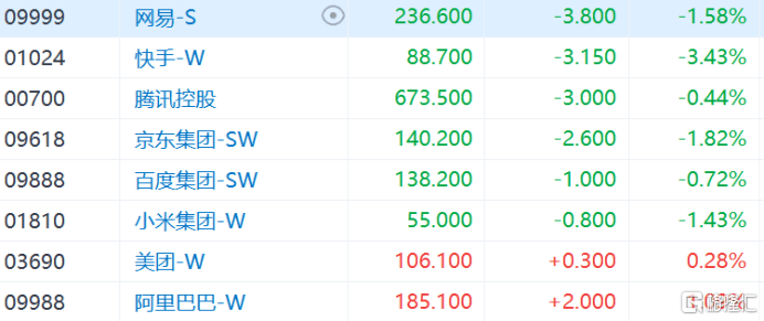 大型科技股多数下跌,快手跌超3%,京东、小米、网易跌超1%,阿里巴巴涨超1%创新高。