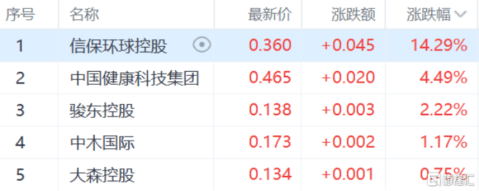 林业及木材板块上涨,信保环球控股涨超14%,中国健康科技集团涨超4%,骏东控股涨超2%。
