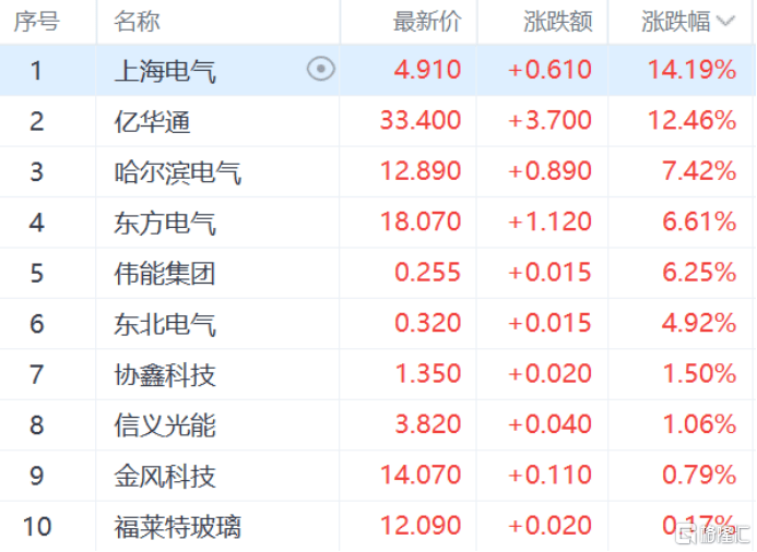 电力设备板块继续上涨,上海电气涨超14%,亿华通涨超12%,哈尔滨电气涨超7%。