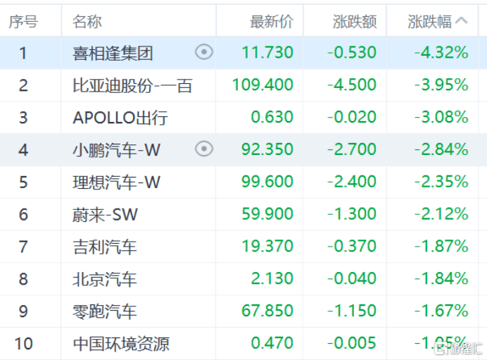 汽车板块下跌,喜相逢集团跌超4%,比亚迪股份、APOLLO出行跌超3%,小鹏汽车、理想汽车、蔚来跌超2%。
