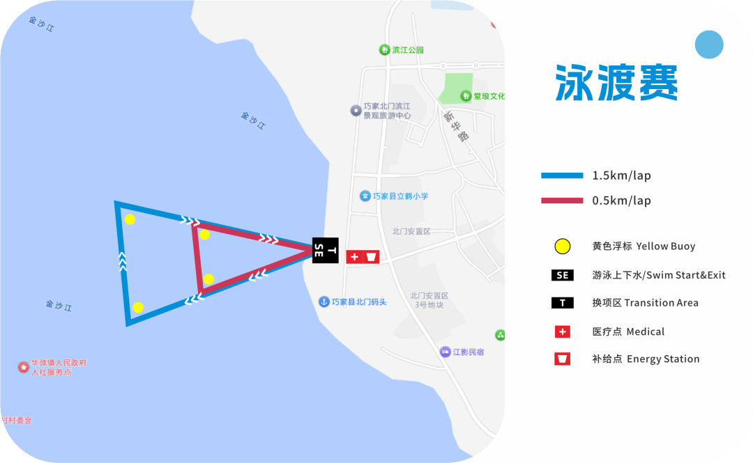 从主会场滨江公园堤岸出发,根据浮标设置在金沙江水域游泳1.5KM和0.5KM,预计水温在18度左右,气温25度左右。