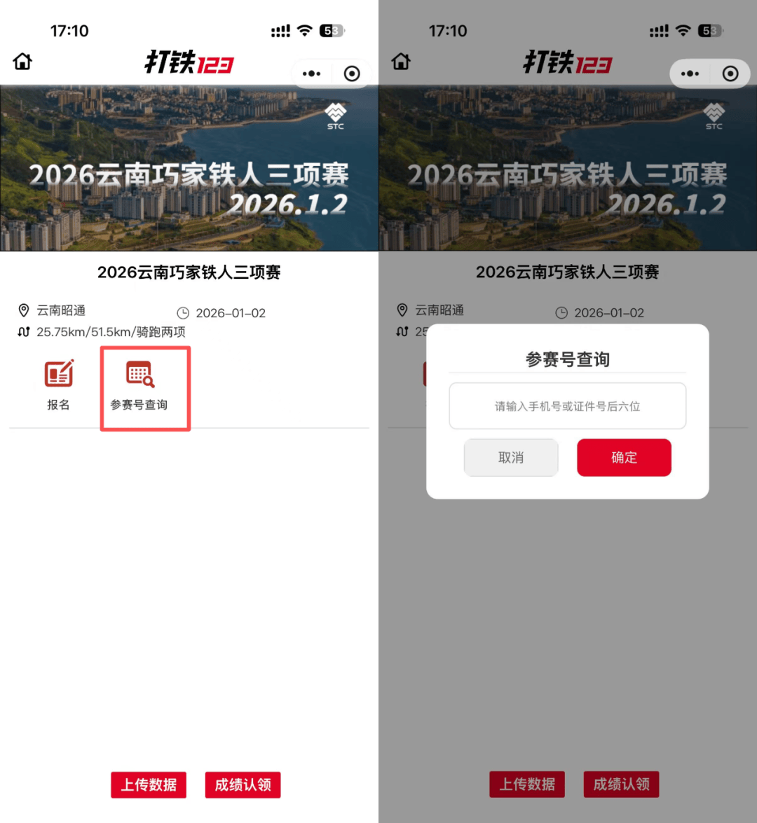 (2)点击“参赛号查询”,输入手机号或证件号后六位查询,待数据导入可进行查询。