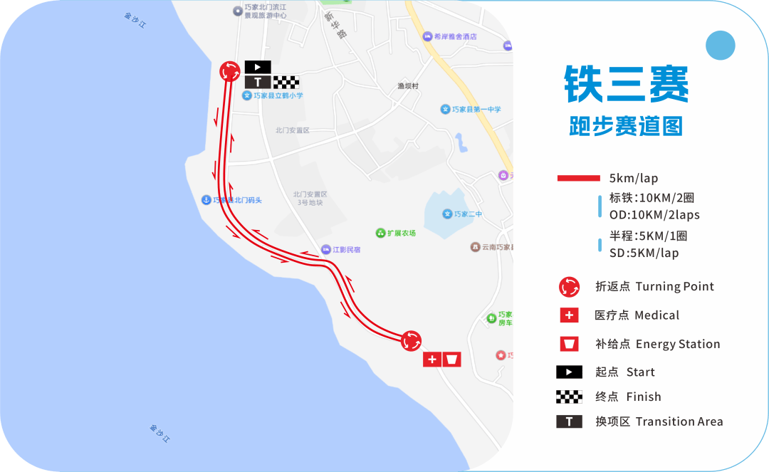 从滨江公园换项区出发,沿金沙江滨江大道跑1圈,共计5KM,跑向终点区域(参考半程铁三跑步路线),跑步赛道补给点位于赛道中间,为双向补给。