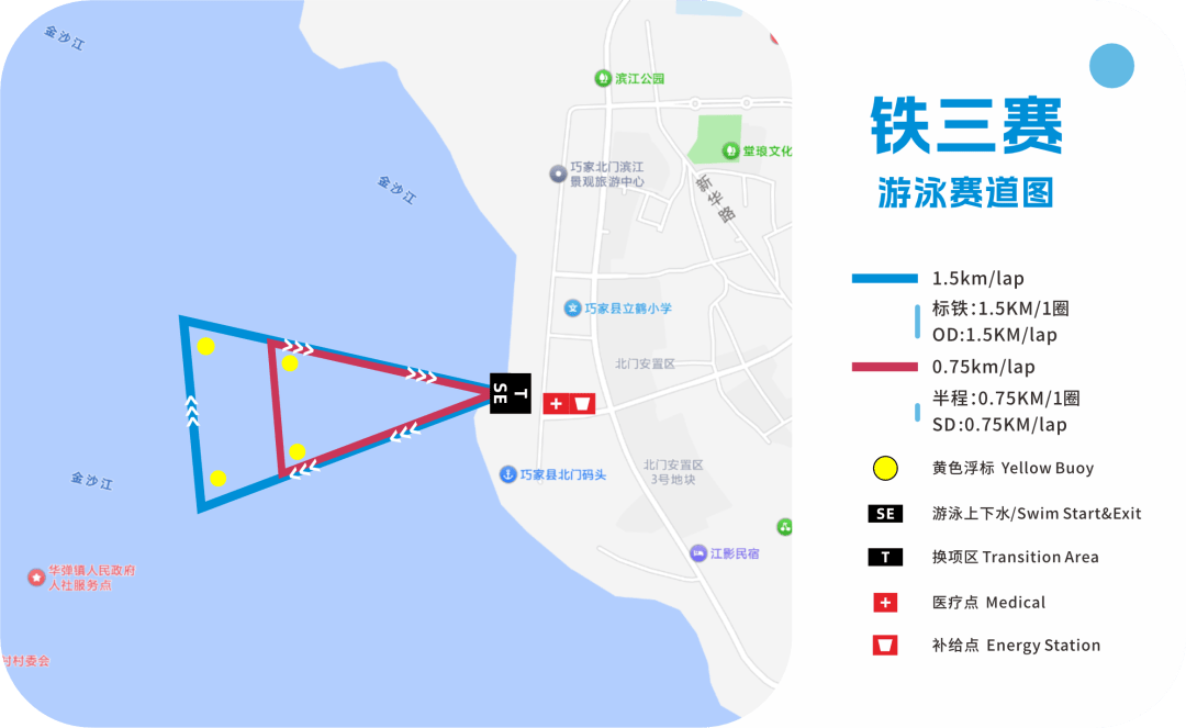 从主会场滨江公园堤岸出发,根据浮标设置在金沙江水域半程游泳0.75KM,标铁游泳1.5KM,预计水温在18度左右,气温25度左右。
