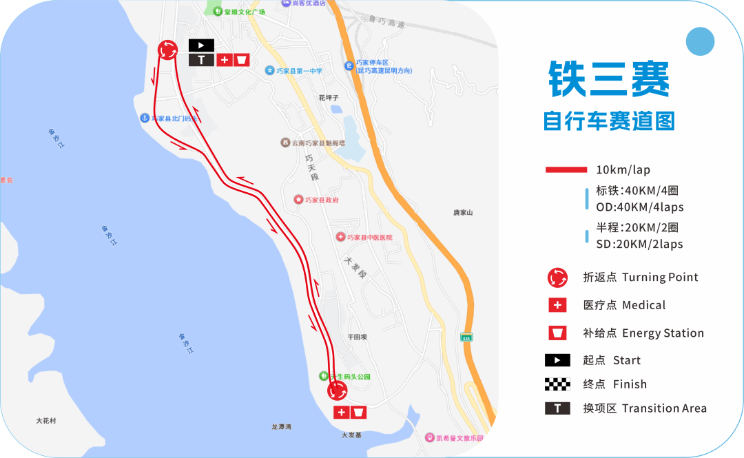 从主会场滨江公园换项区出发,沿金沙江骑行,单圈10KM,骑行4圈,共计骑行40KM,进入换项区(参考铁三自行车路线)第二个跑步赛段