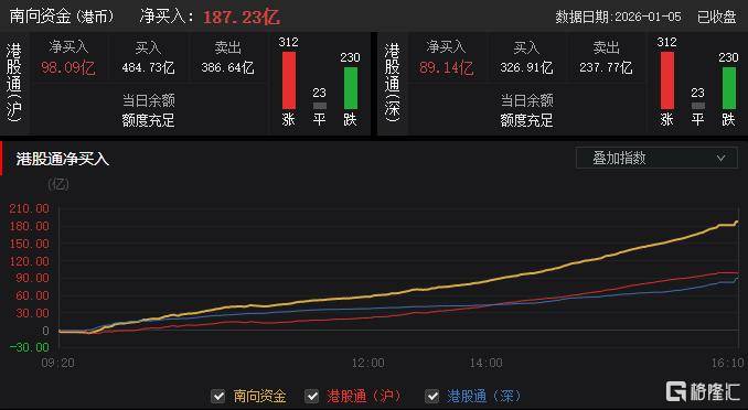 今日,南向资金净买入187.23亿港元,其中港股通(沪)净买入98.09亿港元,港股通(深)净买入89.14亿港元。