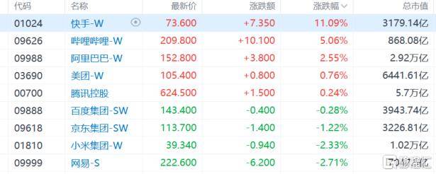盘面上,大型科技股走势分化,快手大涨11%表现尤其抢眼;生物医药股集体活跃,平安好医生领衔互联网医疗股上涨;内房股拉升,脑机接口概念大爆发。汽车股全天低迷,三桶油集体下跌,内银股走低。