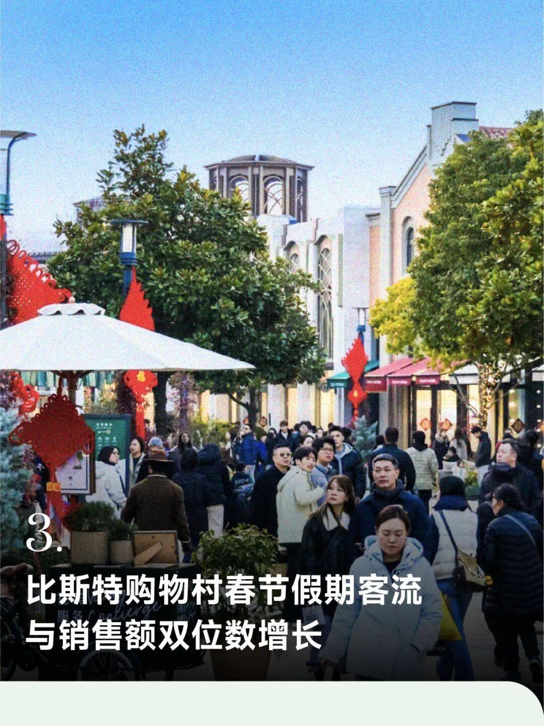 2026 年春节假期,比斯特上海购物村及比斯特苏州购物村表现强劲,依托体验式购物场景与高品质品牌矩阵,客流与销售额均实现双位数增长,创开业以来春节假期新高。两家购物村首次到访的新客人显著增加,其中比斯特苏州购物村非本地游客实现双位数增长,比斯特上海购物村呈高单位数增长。国际游客活跃度提升,离境退税交易笔数及退税金额均实现三位数增长。