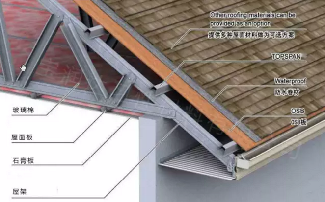 轻钢别墅屋面系统是由屋架、结构OSB面板、防水层(我们用的是沥青防水卷材)、轻型屋面瓦(树脂瓦或沥青瓦,一般业主选用的是沥青瓦,这都是根据客户要求所选择的)组成的。轻钢结构的屋面,外观可以有多种组合。材料也有多种。在保障了防水这一技术的前提下,外观有了许多的选择方案。