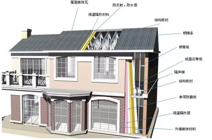 轻钢别墅为确保达到保温效果,在建筑物的外墙和屋面中使用的保温隔热材料(我们可根据客户要求提供多种选择,但通常我们所使用的是吸音玻璃棉、挤塑板等)能长期使用并能保温隔热。轻钢别墅一般除了在墙的墙柱间填充玻璃纤维外,在墙外侧再贴一层保温材料,有效隔断了通过墙柱至外墙板的热桥;楼层之间搁栅内填充玻璃纤维,减少通过楼层的热传递;所有内墙墙体的墙柱之间均填充玻璃纤维,减少户墙之间的热传递。