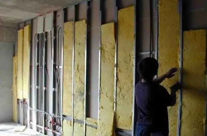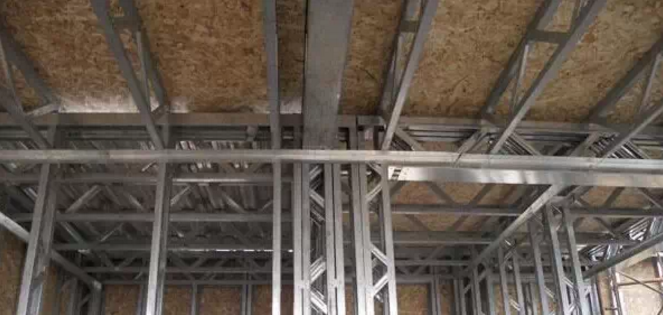 轻钢别墅在内外墙及楼盖搁栅间填充玻璃棉,有效阻止了通过空气传播的音频部分,而对于通过固体传播的冲击声,作如下构造处理:对于分户墙用二道墙柱构成带有中间空隙的两道墙体;而对于吊顶用的固定石膏板的小龙骨,用带有小切槽的弹性构造以有效减少楼层间的固体声传播。