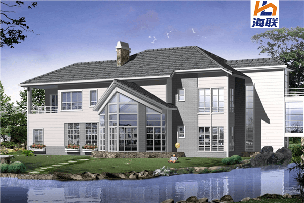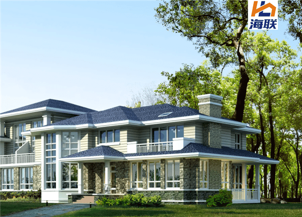 再次,房屋的屋面系统。山东海联轻钢别墅屋架由各种轻钢构件组合拼装而成,一般有三角屋架和T形屋架,可以轻松灵活实现各种复杂的屋面造型。一般屋面采用多彩沥青瓦,具备优良的防水功能,凸显美观和品质。