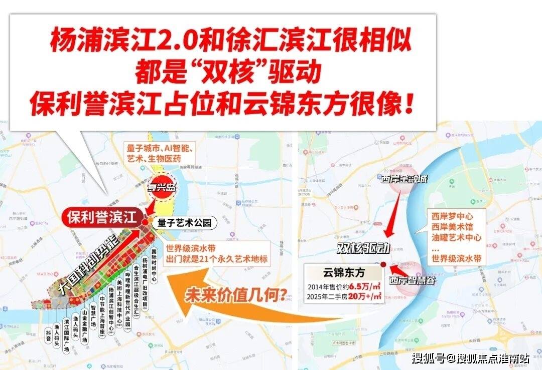 保利誉滨江售楼处电话☎: 值得一提,保利誉滨江在杨浦滨江2.0的位置,与云锦东方如出一辙——二者均处于“双核辐射的中心点”。你要知道云锦东方2014年售价约6.5万/㎡,如今已突破20万+/㎡。