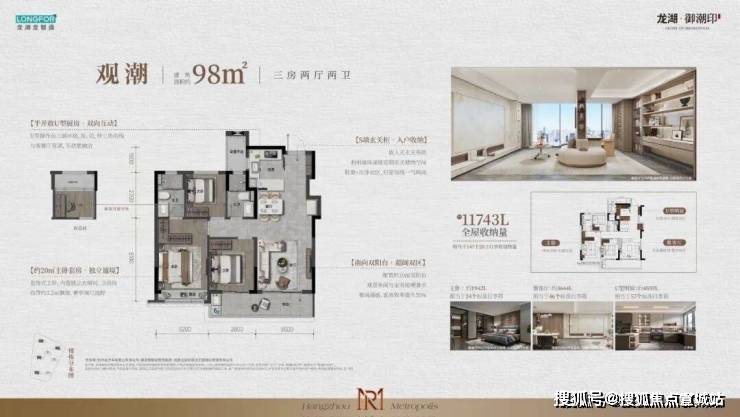 御潮印起步面积约98方,3房2厅2卫,南向约9.5m,双开间阳台全明户型。采用S墙玄关柜、主卧独立衣帽间等多种手段,提高储物效率。御潮印98方给了很多300万预算的朋友,买到钱江世纪城2.0的机会。