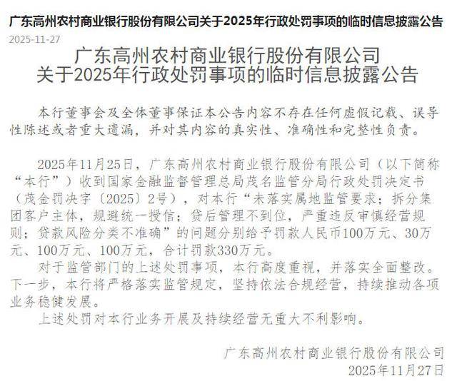 广东高州农村商业银行表示,对于监管部门的上述处罚事项,该行高度重视,并落实全面整改。下一步,该行将严格落实监管规定,坚持依法合规经营,持续推动各项业务稳健发展。