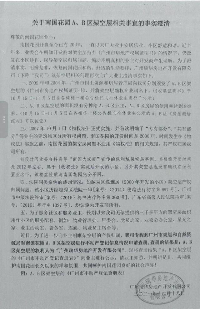 记者了解到,小区开发商在2021年发布的《关于南国花园 A、B区架空层相关事宜的事实澄清》中,主张小区A、B区架空层为其单独所有。主要理由是A、B区架空层在2002年和2004年已由政府颁发《权属证明书》,完成确权。2007年10月1日《中华人民共和国物权法》(以下简称《物权法》)正式实施,并首次明确了“专有部分”“共有部分”等业主的建筑物区分所有权问题。南国花园的开发时间是2000年,时间发生在《物权法》实施之前,南国花园的架空层问题不适用《物权法》的相关规定;法院同类案件裁判情况亦认定类似的架空层属于开发商所有。但业委会并不接受上述主张。