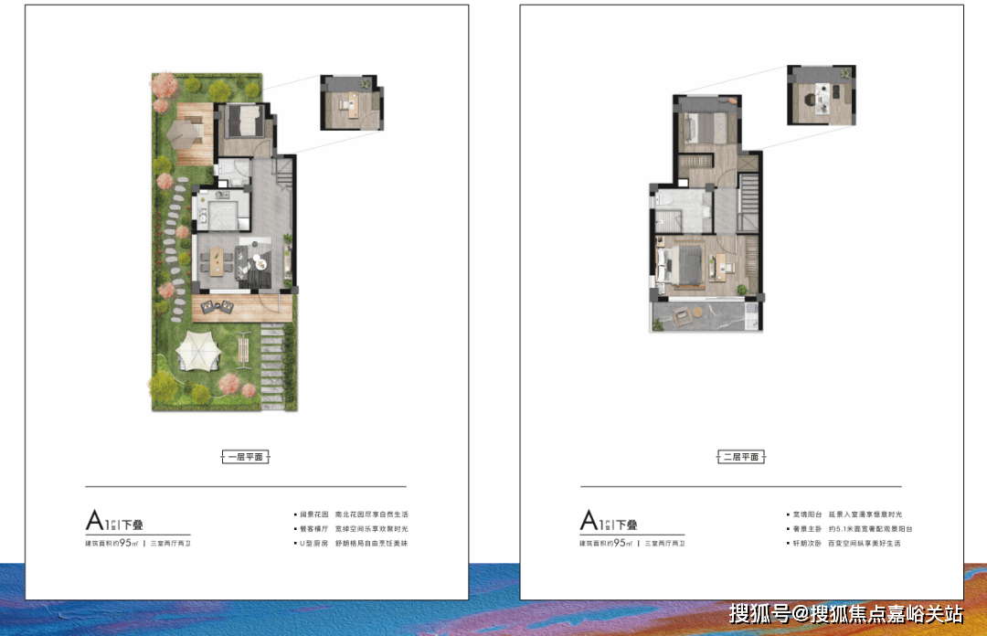 来看户型,面积段有两种——建面约95㎡下叠、上叠;建面约150㎡下叠、上叠。