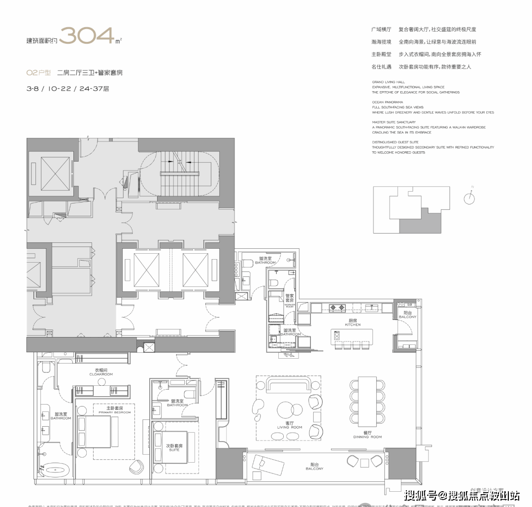 两房三卫+家政套间。LDK一体化横厅,动静分区彻底。双卧室均为套房,主卧配备步入式衣帽间。拥有最佳观海方位,动区空间尺度感突出,主卧采光与景观俱佳。仅设两房,功能纯粹;公卫为暗卫;家政动线未完全独立。