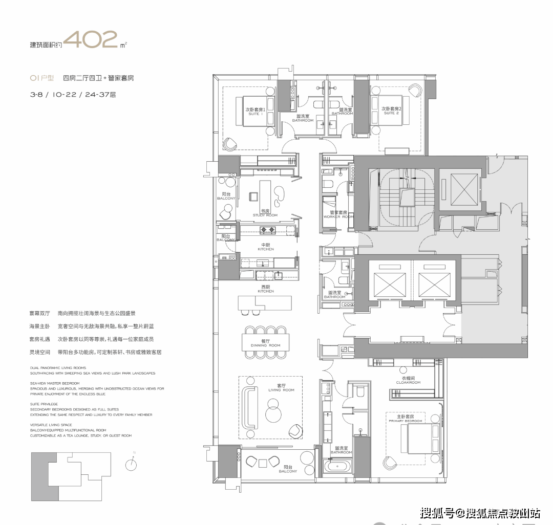 项目由联泰集团开发,依托开发商雄厚的资金实力与多年高端物业开发经验,规避了烂尾风险,进一步提升了置业信任度。其定位核心可概括为三点:一是“稀缺性”,作为深超总近20年来仅有的涉宅项目,容积率仅3.0,在遍地容积率突破15的超高层写字楼、高密度公寓中,堪称“降维打击”,实现了“出则繁华,入则静谧”的顶豪居住体验;二是“纯粹性”,户型起步即300㎡,无中小户型,彻底筛定高端客群,聚焦终极改善与资产收藏需求,汇聚大湾区企业主、金融精英及行业领军人物,形成纯粹的塔尖圈层;三是“复合型”,业态涵盖4栋超高层公寓、2栋总部办公、19套独栋董事公馆、16套合院别墅及1.4万㎡高端商业,既保证了居住的纯粹性,又兼顾了顶豪圈层的商务、休闲需求,打造“一站式顶奢生活闭环”。