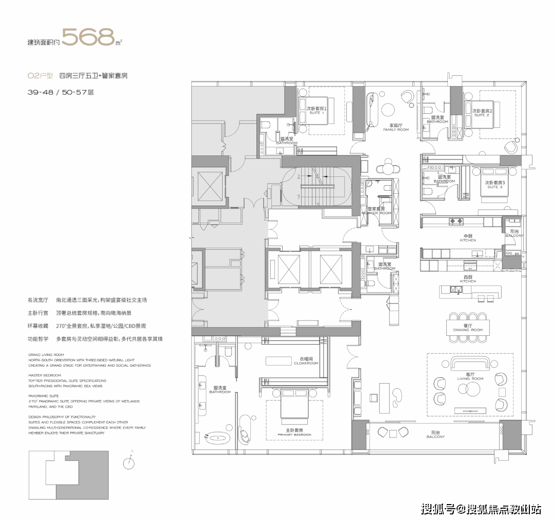 (3-57层)T3栋 四房四卫+家政套间。中西厨分区,餐客西厨一体,带多功能房。端头位置,三面采光。功能完备,房间数充足;实现了主仆双动线;会客观景视野一流。