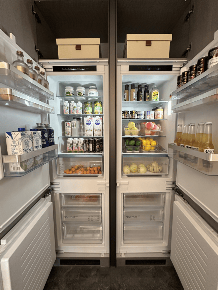 入户处,在当下常见的户型设计里,上图里的这个空间往往被作为冰箱使用,但实际上,冰箱与厨房的动线较长,使用并不方便。象屿的做法,