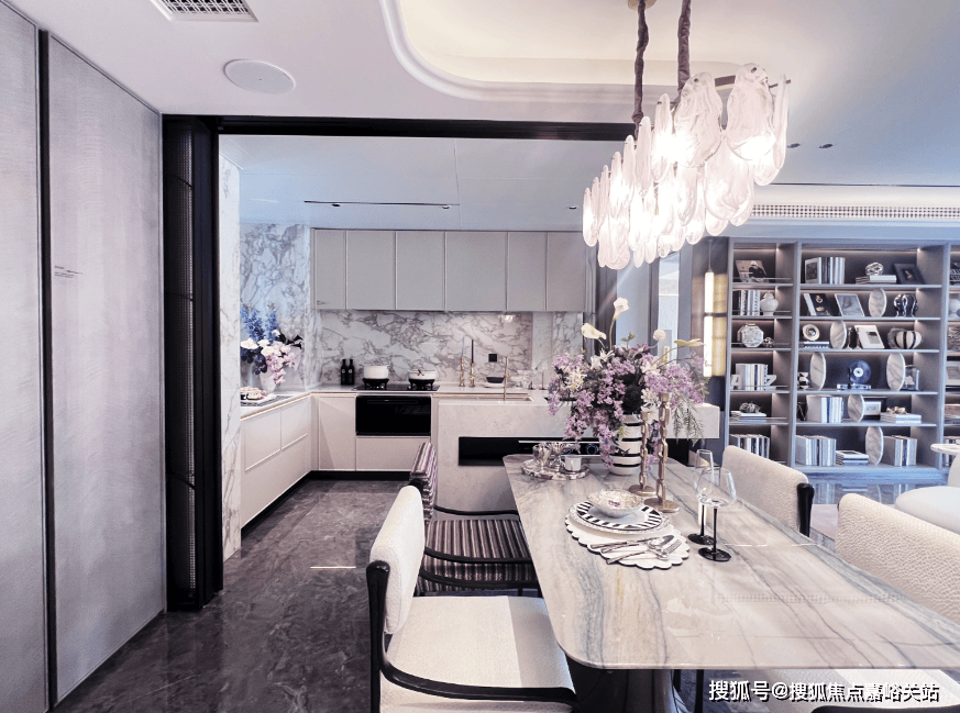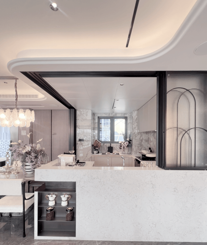,多出的一段岛台空间,为交付标准,同时预留岛台收纳,岛台的存在,加强了家庭中人与人之间的交互,将成为未来维系家庭关系的重要纽带。生活示范空间,布局及装饰均为第三方装修提供,仅供参考,如有更改请留意最新资料,具体以合同实际交付为准