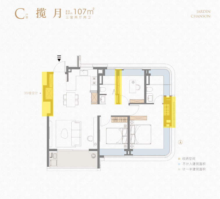 通过S墙的设计,预留的衣柜的凹龛,未来可供业主全屋定制做柜子使用,解决日常收纳问题。
